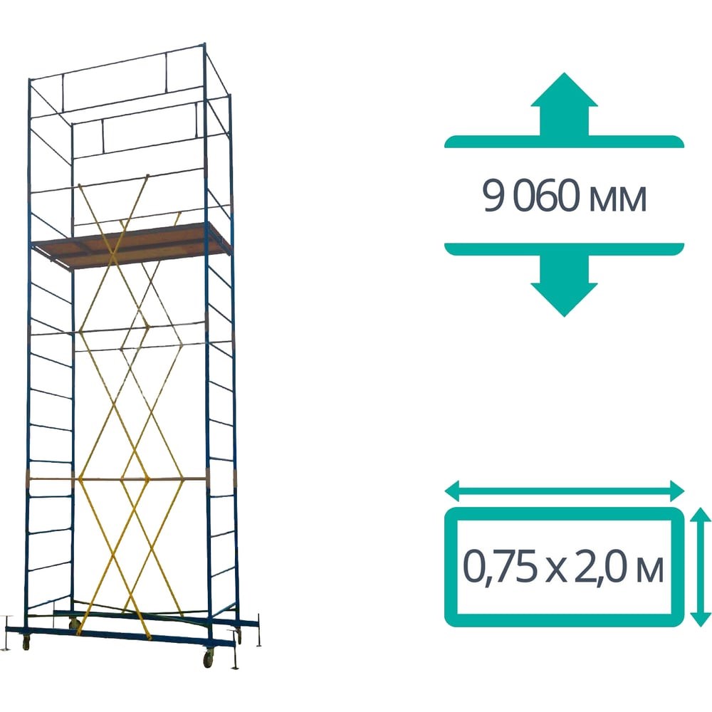 Максимальная высота (с учетом верхних ограждений) вышки составляет 9217 мм, а предельный уровень установки рабочего настила не превышает 8162 мм. Основными элементами туры выступают рамы из круглой трубы (42 мм) с внутренними перекладинами. Для выравнивания подмостей, основание дополняется домкратами, а для обеспечения устойчивости – стабилизаторами. Важно отметить, что все стальные детали вышки покрываются полимерной краской для предотвращения появления ржавчины.