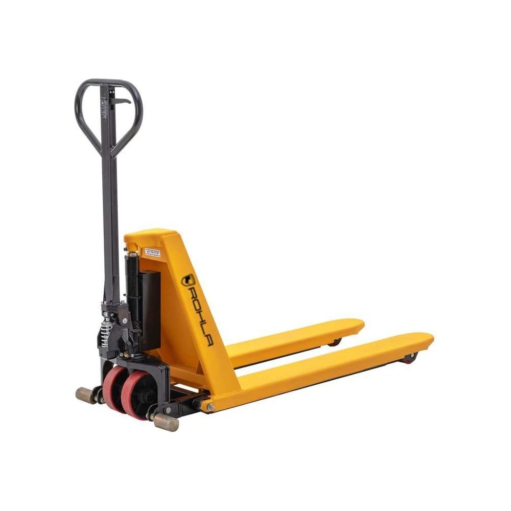 Высокоподъемная гидравлическая тележка RohlaRhino высота подъема 0,8 м, грузоподъемность 1 т RRSDHL10 отличается от стандартных тележек увеличенной высотой подъема 800 мм и имеет грузоподъемность 1000 кг. Конструкция позволяет использовать тележку в качестве подъемного стола. Модель оснащена телескопическим трёхштоковым гидроцилиндром высокого качества и двумя боковыми стабилизаторами, обеспечивающими повышенную устойчивость. Для дополнительной безопасности конструкция опорных стоек не позволяет тележке двигаться при поднятых вилах. Ведущие колеса диаметром 180 мм из полиуретана и опорные ролики облегчают передвижение тележки и повышают плавность хода и легкость поворотов.