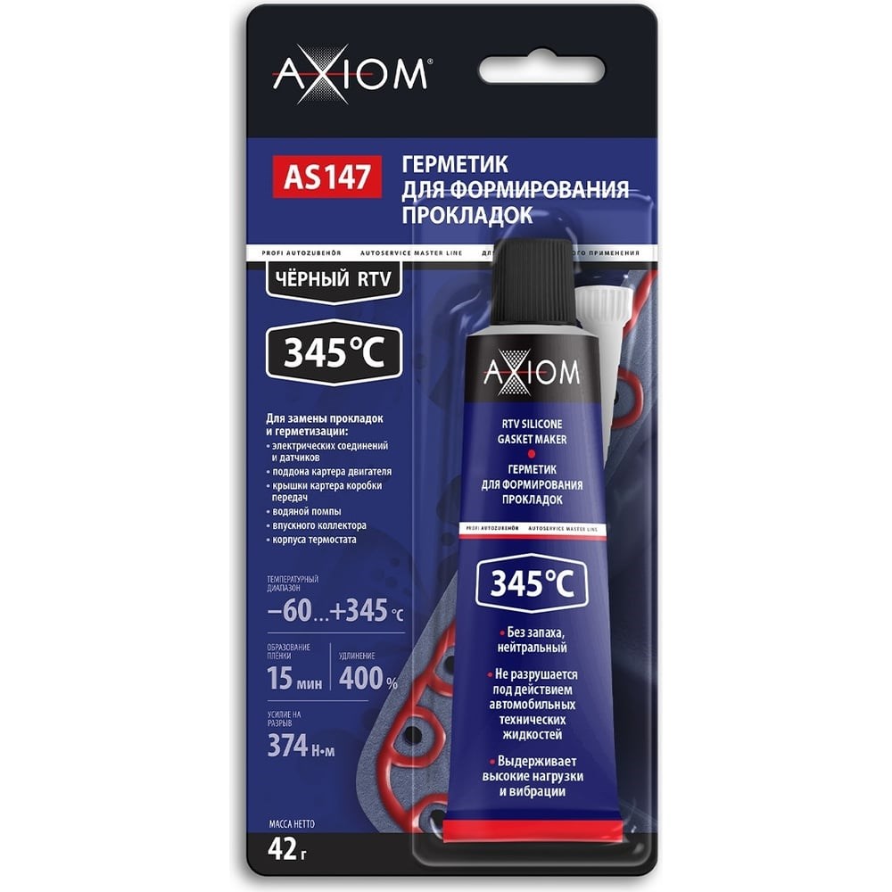 Герметик для формирования прокладок высокотемпературный AXIOM RTV чёрный AS147 - однокомпонентный автомобильный силиконовый герметик, применяется для формирования или ремонта прокладок в узлах автомобиля, подверженных воздействию высоких температур, таких как поддон картера и коробки передач, водяной насос, крышка газораспределительного механизма, корпус термостата и других. Способен заменить прокладки, сальники, а также бумажные, резиновые, металлические и другие уплотнители.Не содержит растворителей и кислот, не вызывает коррозии, может применяться для герметизации электрических соединений и датчиков. Вулканизирующийся при комнатной температуре RTV‑силикон образует прочную, эластичную прокладку (удлинение до разрыва 400%). Обладает повышенной адгезией к поверхностям из стали, чугуна, алюминия. Стоек к воздействию технических жидкостей автомобиля (смазочных материалов, охлаждающих жидкостей, растворов кислот и щёлочей). Заполняет полости и зазоры до 7 мм.Отверждённый герметик может эксплуатироваться в температурном диапазоне от –60°C до +345°C (кратковременно).Аналог 8460063937