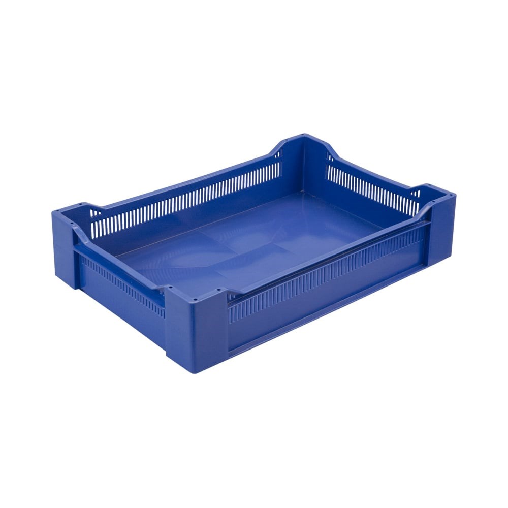 Ягодный ящик п/э 600х400х135 сплошное дно синий Тара.ру 02365 можно использовать для хранения, выставления на прилавок или транспортировки ягод.Наличие невысоких бортов значительно снижает давление на нижние слои и позволяет сохранить целость всей продукции.
