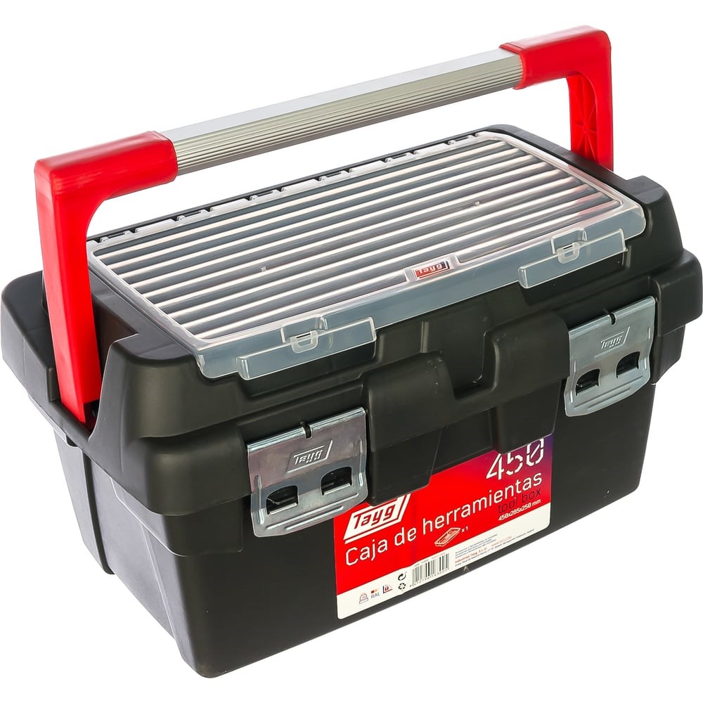 Ящик для инструментов фирмы Tayg. В комплекте имеются лоток и органайзер. Размер данной модели: 450x285x250мм.Ящик для инструмента Tayg - это профессиональный ящик для хранения и транспортировки инструментов, который используется в различных отраслях промышленности, строительства, ремонта и других областях. Он выполнен из прочного пластика, имеет удобную ручку для переноски и металлические замки для защиты содержимого от повреждений. В ящике есть просторное отделение, лоток с ручкой и органайзер для хранения различных инструментов: сверл, ключей, отверток, молотков и т.д. Ящики Tayg отличаются высоким качеством изготовления и надежностью, что делает их идеальным выбором для профессиональных мастеров и любителей.Наличие лотка для мелочей создает дополнительное пространство для крепежа.
