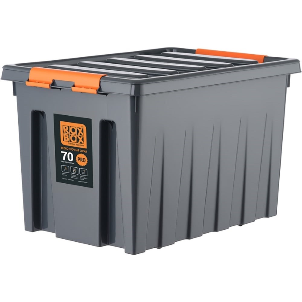 Ящик Rox Box п/п 590х395х370 мм с крышкой и клипсами, на роликах, PRO, 70 л. цв. антрацит 25342 используется для эффективной организации пространства. Предназначен для хранения пищевых продуктов, сезонных вещей, игрушек. Оснащен прочными фиксаторами. Защелка-клипса обеспечивает герметичное закрытие крышки контейнера и отлично защищает от пыли, неприятных запахов. Ящики данной серии обладают высокой ударопрочностью.