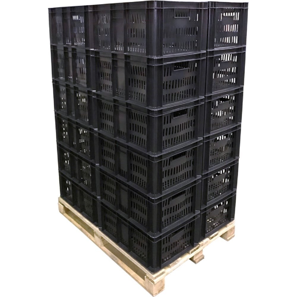 Ящик Тара.ру п/э 600x400x250, перфорированный, комплект 24 шт., чёрный 27014 можно без труда использовать для транспортировки и хранения колбас и сосисок. Модель изготовлена из прочного пластика с дополнительными ребрами жесткости. Перфорированные стенки исключают образование влаги внутри ящика. Ящики поставляются на паллете, габариты 1200х800х1600 мм.