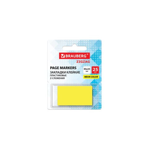 Закладки клейкие Z-сложения, неоновые желтые, BRAUBERG ZigZag, 45х25 мм, 25 шт., в диспенсере, 116676