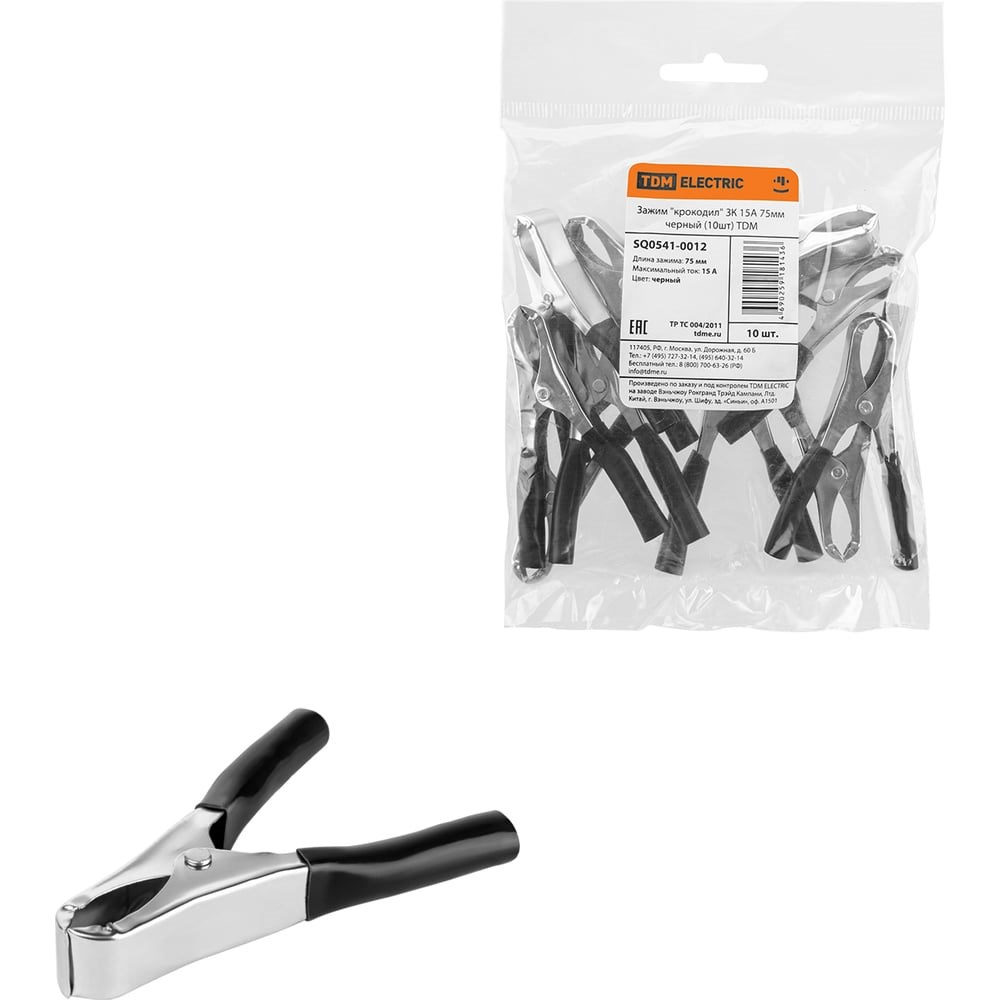Зажим для проводов (крокодил) ЗК 15А 75мм черный упаковка 10 штук TDM Electric - это надежное и удобное решение для временного соединения проводников. Зажимы "крокодил" незаменимы для временного соединения проводов или их фиксации. Они используются при диагностике, ремонте и пусконаладке электрических и электронных систем, а также для подключения измерительных приборов, шунтов и других устройств. Зажимы ЗК полностью изолированы, что обеспечивает безопасность их использования. Изоляция выполнена из поливинилхлорида (ПВХ), который известен своей прочностью и устойчивостью к воздействию различных сред. Фигурные детали (челюсти) зажимов изготавливаются штамповкой из никелированного листового металла, что гарантирует их прочность и долговечность. Упаковка по 10 штук оптимальна для реализации через розничные сети, а черный цвет зажимов делает их незаметными на проводах. Выбирая зажим для проводов (крокодил) ЗК 15А 75мм черный упаковка 10 штук TDM Electric, вы получаете надежное и безопасное решение для временного соединения проводников и подключения измерительных приборов.