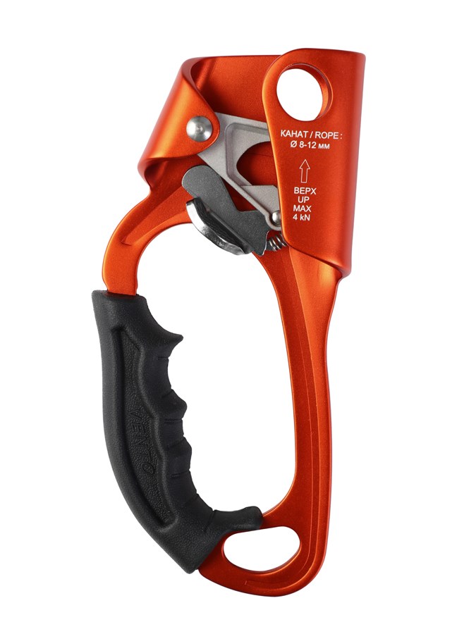 Зажим под левую руку предназначен для подъема по вертикальным или наклонным перилам, а также применяется при проведении спасательных работ. Соответствует EN 567 и ГОСТ EN 12841-2014 для использования в системах канатного доступа. Жумар совместим со статическими (ГОСТ EN 1891-2014) и динамическими (EN 892) веревками.