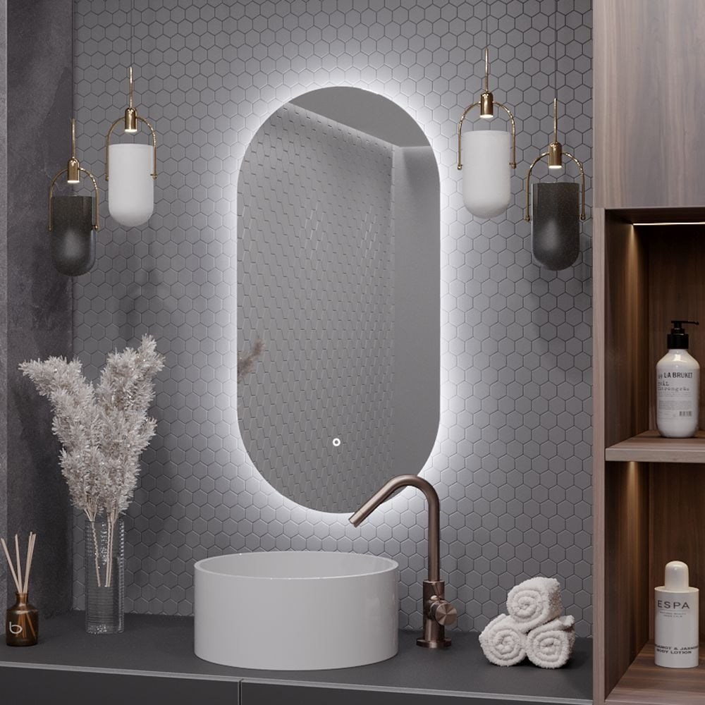 Зеркало с подсветкой в ванную "парящее". Сенсорный выключатель с белой индикацией кнопки и диммером (регулировка яркости длительным нажатием на кнопку) расположен снизу по центру. Зеркальное полотно бельгийского бренда AGC толщиной 4 мм, толщина подложки 16 мм, кромка зеркала шлифованная. Питание от сети 220В. Стандартное подключение – скрытый монтаж к проводу, выведенному из стены. Вешается на два самореза с дюбелями (входят в комплект) на проушины, расположенные на тыльной стороне зеркала.