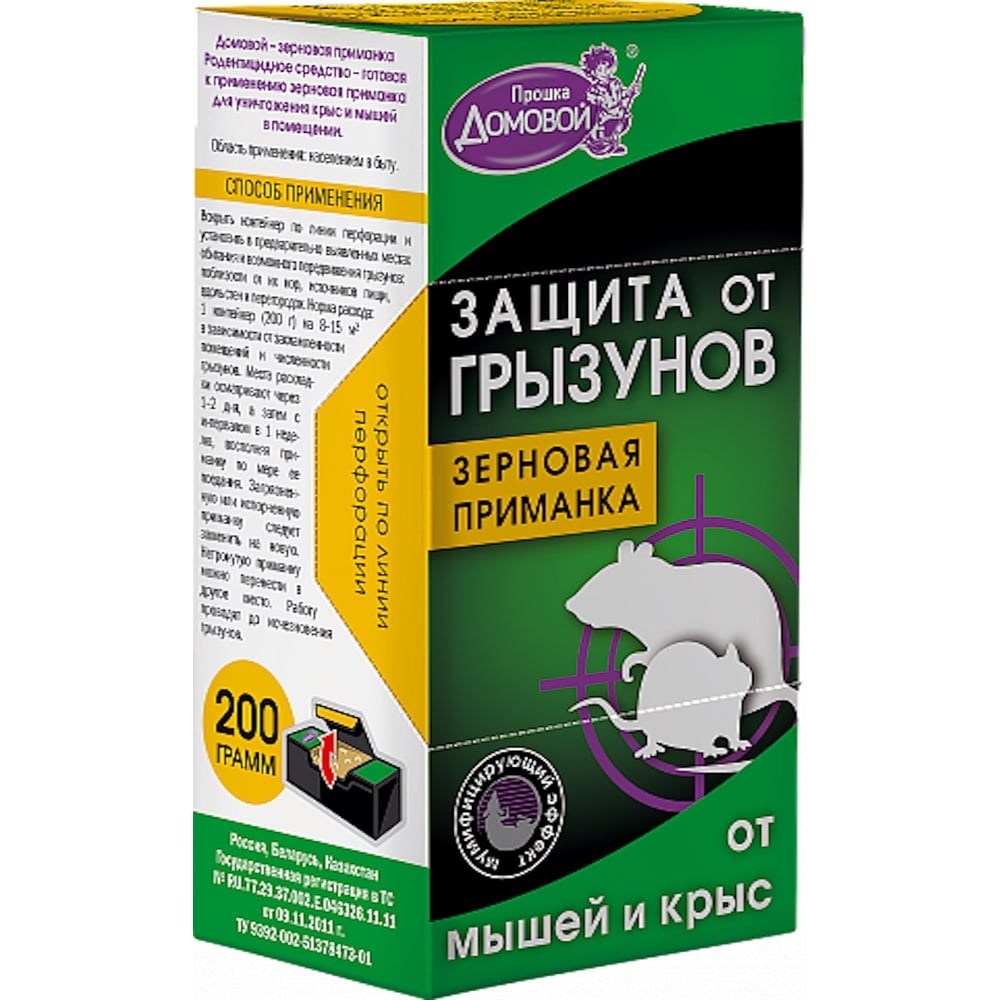 Зерно от грызунов Домовой Прошка контейнер 200 г 22437 обеспечивает гарантированное уничтожение крыс (серых, черных, водяных) и мышей. Подходит для применения в быту. Обладает мумифицирующим эффектом.