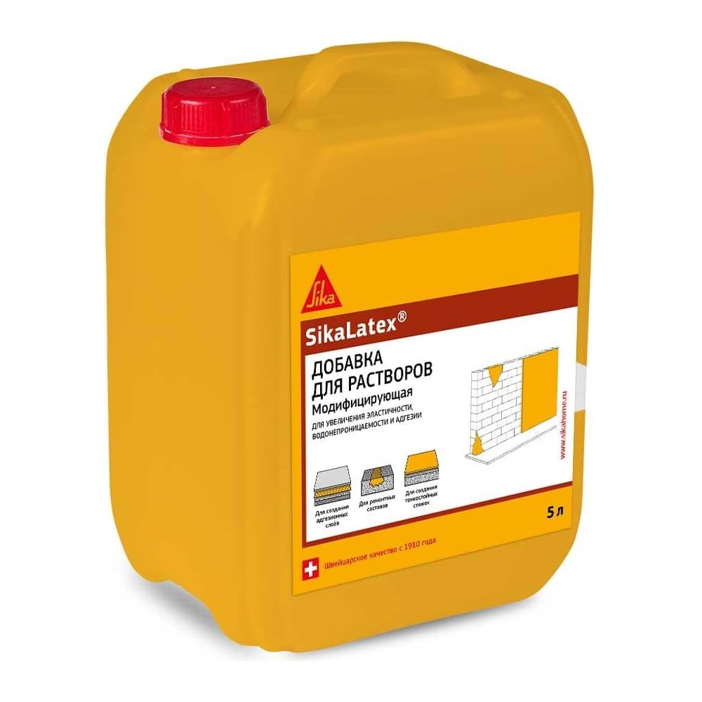 Многофункциональная добавка для создания адгезионных слоёв и улучшения свойств цементных растворов SikaLatex® - водная эмульсия синтетического каучука, используемая в качестве добавки в строительные растворы для создания адгезионных слоев и улучшения свойств строительных растворов. Предназначена для снижения усадки, повышения водонепроницаемости и прочности, уменьшения пыления цементных стяжек, создание адгезионных слоев на гладком бетоне, повышения пластичности и удобоукладываемости растворов. Применяется в качестве добавки для следующих цементных растворов: Штукатурки Стяжки для пола Ремонтные растворы Кладочные смеси Клеи для плитки и затирки для швов Рекомендуемая дозировка Адгезионные слои SikaLatex® : Вода = 1 : 1 Строительные растворы SikaLatex® : Вода = 1 : 1 до 1 : 3