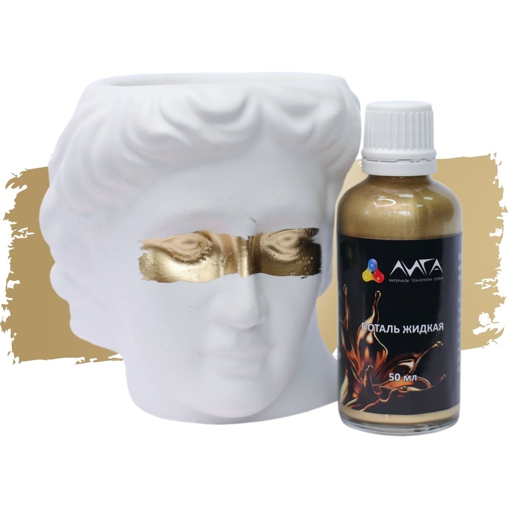 Жидкая поталь Лига Сусальное золото (50 мл) - это продукт на основе синтетических смол и металлических пигментов имитирующая цвет и блеск сусальных листов. Область применения Используется для декорирования карнизов из ПУ и дерева, отдельных архитектурных элементов, на ненагруженные поверхности, при использовании на нагруженных поверхностях можно перекрыть акриловым лаком, но степень блеска изменится Материал наносится на загрунтованные поверхности. Cушка после нанесения 10 минут ,полное высыхание через 2 часа Для защиты от окисления, рекомендуется нанести лак для жидкой потали, артикул Перед использованием хорошо взболтать продукт в течении 1 мин.