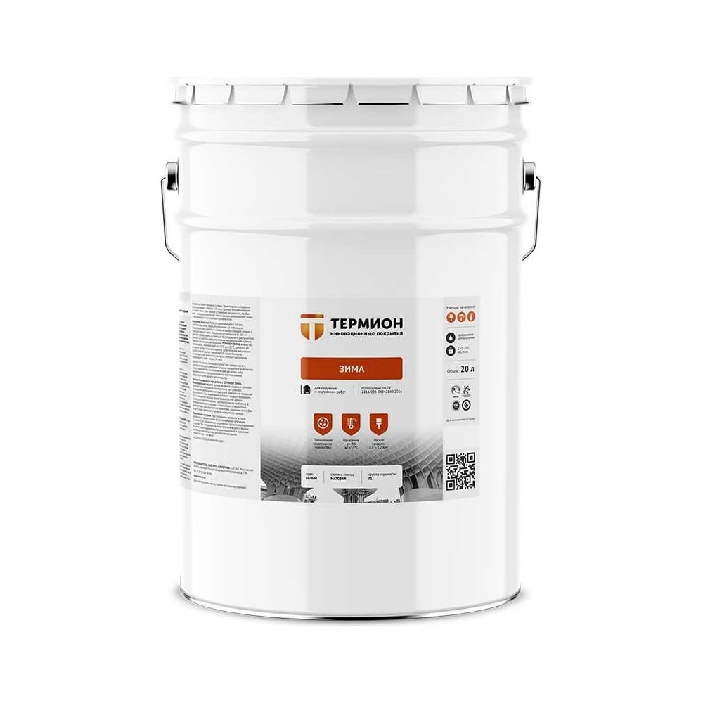 Жидкая теплоизоляция ТЕРМИОН Зима 20 л 21168742 – единственная модификация из всех известных на сегодняшний день в линейке сверхтонких жидких теплоизоляционных материалов, с которой можно работать при температуре до -35 °С. Утепление фасадов, внутренних и внешних стен зданий, балконов, мансард и лоджий, подвалов и цокольных этажей, металлических конструкций и кровли, способствует предотвращению образования конденсата, наледи и сосулек на крышах, трубопроводах и газопроводах. Жидкая теплоизоляция ТЕРМИОН ЗИМА по принципу использования сравнима с обычными эмалями, но за счет входящих в состав стекло-керамических микросфер с разряженным воздухом внутри и низким коэффициентом теплопроводности работает как термобарьер . Принцип действия: вязкая фракция, состоящая из высококачественного связующего, содержит в себе наполненные разряженным воздухом (технический вакуум) микросферы из стекло-керамики с низким коэффициентом теплопроводности. При нанесении на любую поверхность, покрытие полимеризуется, поверхность покрывается плёнкой из вакуумированных керамических микросфер, образуя термобарьер. НАНЕСЕНИЕ Подготовить покрытие к нанесению. Содержимое ведра с жидкой теплоизоляцией перемешать в ручную или дрелью с насадкой, при скорости не более 200 оборотов в минуту. Изолируемая поверхность должна быть сухой, очищенной от пыли, грязи и жировых загрязнений.