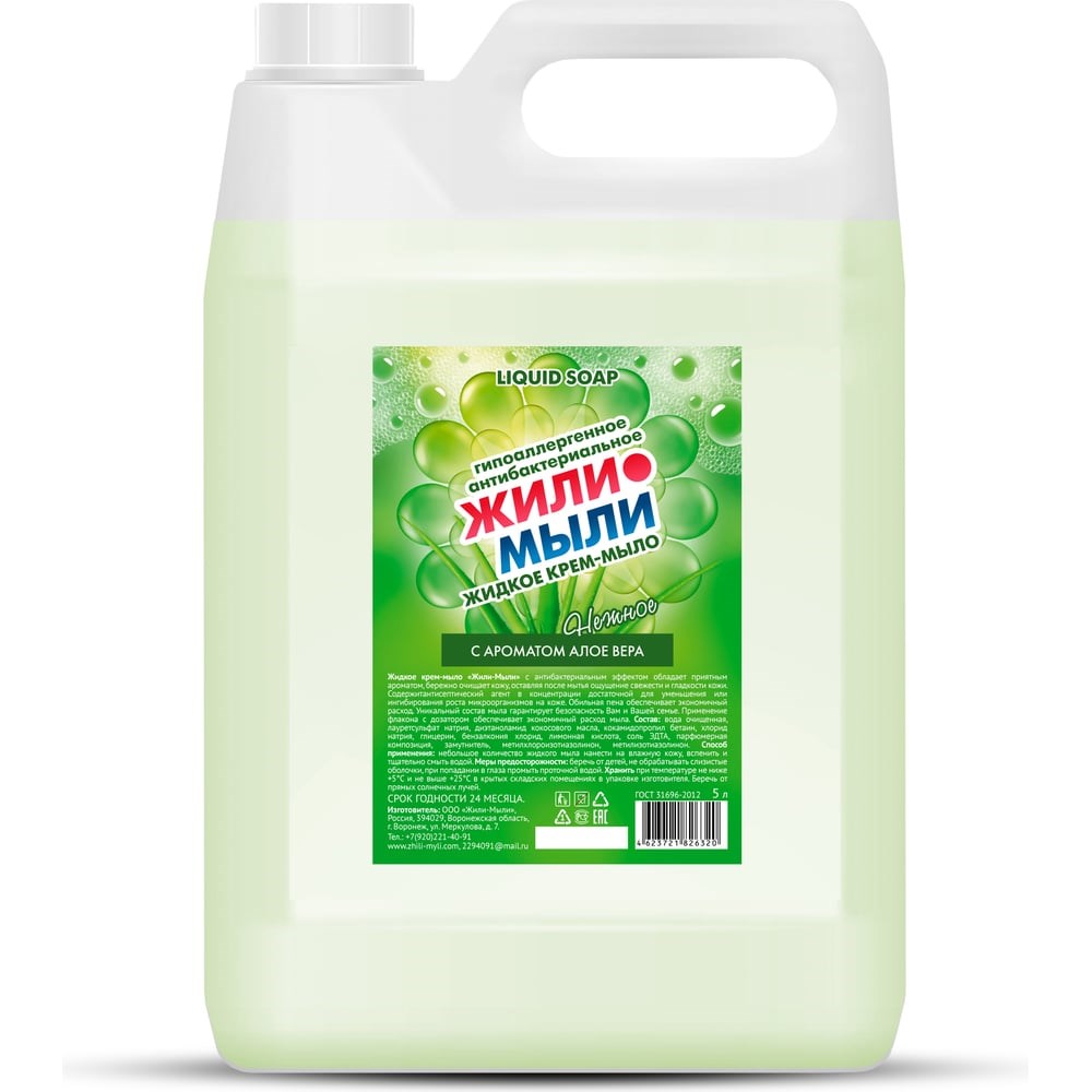Антибактериальное жидкое мыло «Жили - Мыли» с приятным ароматом алоэ бережно очищает кожу, оставляя после мытья ощущение свежести и гладкости кожи. Содержит антисептический агент в концентрации достаточной для уменьшения или ингибирования роста микроорганизмов на коже. Данный компонент проявляет бактерицидную активность в отношении стафилококков, стрептококков, грамотрицательных бактерий, анаэробных бактерий, грибов и плесеней.Антибактериальное мыло предназначено для мытья рук и тела работников предприятий пищевой и перерабатывающей промышленности, организаций здравоохранения, в медицинских, лечебно-профилактических, учебных дошкольных и школьных учреждениях парфюмерно-косметических предприятий; объектах железнодорожного транспорта, включая метрополитен, предприятий общественного питания, коммунальных объектах (курортные и гостиничные комплексы, парикмахерские и т.п.), курортных учреждений, а также населением в быту.Способ применения: намочите руки водой и выдавите небольшое количество мыла, нажав на носик-дозатор. Тщательно растирайте мыло по всей поверхности рук, включая тыльную сторону и пространство между пальцами, в течение 20-30 секунд. Смойте пену под проточной водой. Благодаря своему составу мыло не пересушивает кожу, а делает руки чистыми и увлажненной.