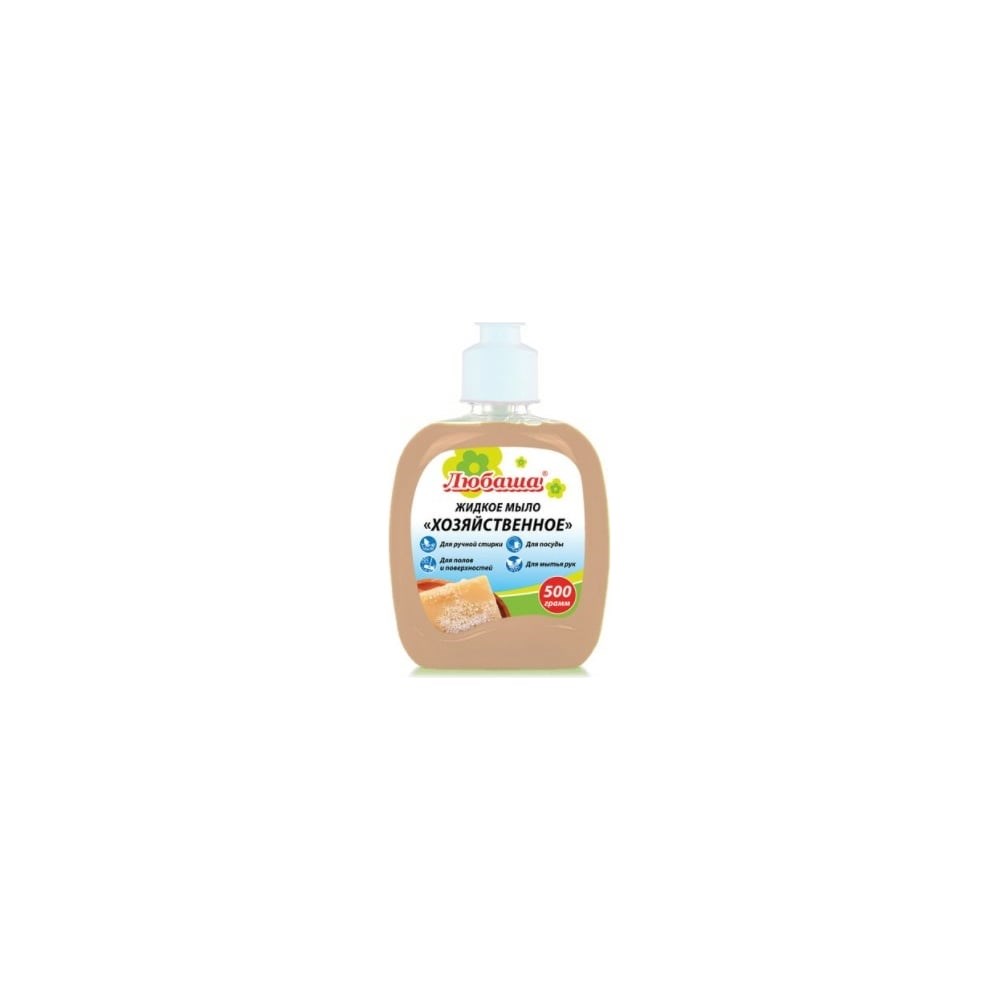 Жидкое мыло ЛЮБАША 500 г, Хозяйственное 606380 можно применять для мытья посуды, рук, для стирки белья. Средство поставляется во флакон без дозатора (система флип-топ). Состав: Aqua, Sodium Chloride, Sodium Laureth Sulfate, Cocamide DEA, Cocamidopropyl Betaine, Styrene/Acrylates Copolymer, Parfum, DMDM Hydantoin, Methylchloroisothiazolinone, Methylisothiazolinone, C.I. 19140, C.I. 42090, C.I. 16255, C.I. 15985. Соответствует ГОСТ 31696-2012.