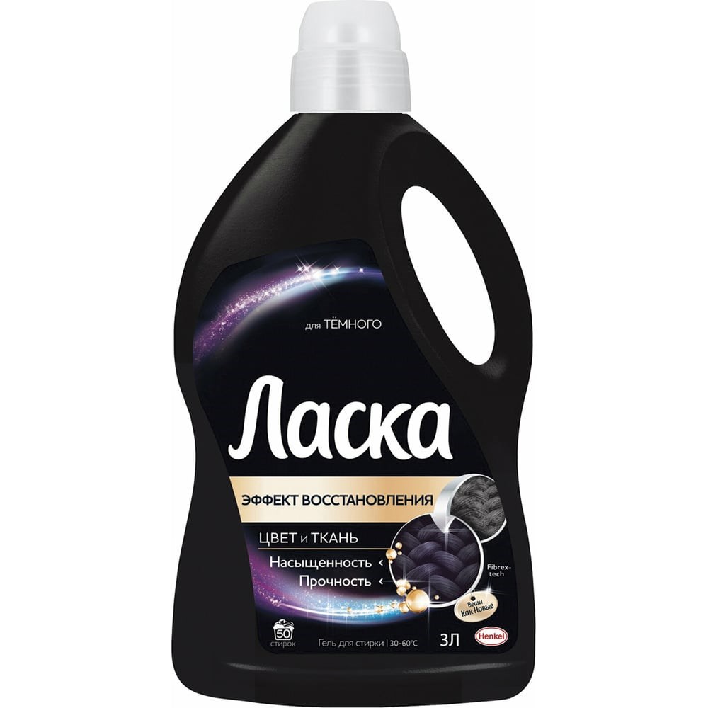 Жидкое средство для стирки ЛАСКА автомат, 3 л, Сияние черного, гель-концентрат 601890 благодаря специально разработанной системе защиты цвета сохраняет структуру ткани, восстанавливает яркость и интенсивность цвета даже после частых стирок. Предохраняет от выцветания. Для ручной и автоматической стирки. Ласка "Сияние черного", – это средство для стирки одежды черного и темных цветов. Формула Fibrex-tech с эффектом восстановления цвета ткани была специально разработана для активного ухода за одеждой и поддержания первозданной красоты вещей стирка за стиркой. Она не только бережно отстирывает загрязнения, но и отлично заботится об одежде в двух ключевых направлениях: Насыщенность цвета: Защищает яркость цвета, препятствуя переносу красителя во время стирки Разглаживает шероховатые волокна для оптимального отражения света Прочность ткани: Сохраняет прочность ткани