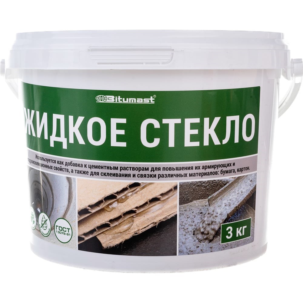 Жидкое стекло, 3 кг Bitumast 4607952900547 используется в качестве добавки к строительным растворам для наилучшего сцепления материалов, склеивания бумаги, стеклянных и фарфоровых изделий, а также для пропитки древесины с целью придания огнеустойчивости и долговечности. Применение: очистить поверхность от загрязнений и просушить. При нанесении в качестве клея наносить кистью или валиком. При смешивании с сыпучими строительными материалами, смешать - 1л жидкого стекла на 10л строительного порошка. В качестве грунтовки: смешать жидкое стекло и цемент в пропорции 1:1. В качестве гидроизоляции колодца: нанести на стенки колодца жидкое стекло, затем покрыть раствором из жидкого стекла, цемента и песка в пропорции 1:1:1. Для ремонта наружных частей каминов или дымовых труб: смесь цемента и песка (1:3), развести 15% раствором жидкого стекла. Для гидроизоляции стен: смешать жидкое стекло и бетонный раствор в пропорции 1:10.