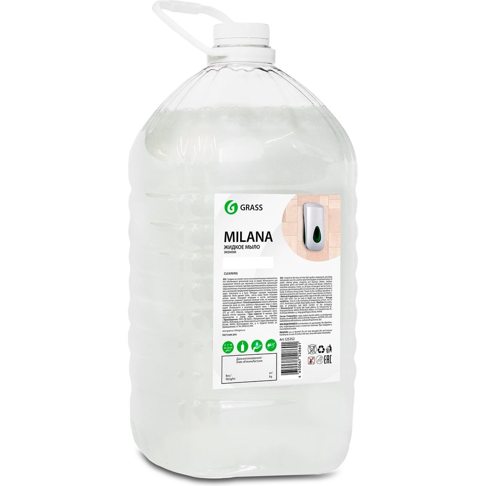 Жидкое мыло Grass Milana эконом, 5 л 125352 используется для ежедневной гигиены рук персонала и посетителей организаций общественного питания, торговых и деловых центров, медицинских, образовательных, спортивно-оздоровительных и культурно-досуговых учреждений, предприятий промышленности, гостиниц, на всех видах транспорта и в быту. Обладает хорошим очищающим эффектом. Легко удаляет грязь, масла, жиры, белки. Устраняет резкие запахи. Благодаря входящим в состав смягчающим компонентам, сохраняет защитные функции кожи, не вызывая ее сухости и раздражения. Способ применения: Нанести небольшое количество мыла на кожу, добиться образования пены и смыть водой. Используется в дозаторах жидкого мыла.