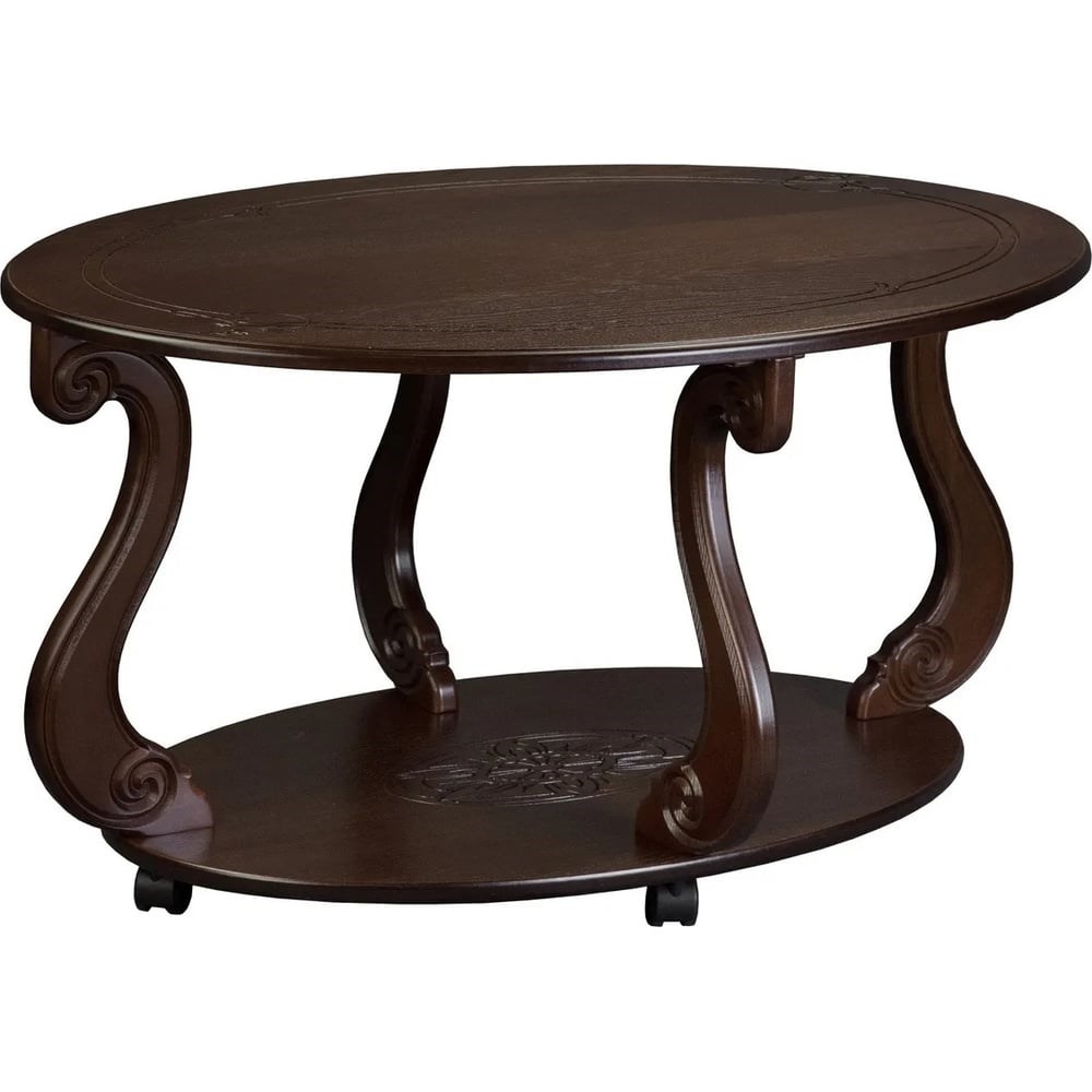 Овальный журнальный столик — идеальное решение, чтобы дополнить дом теплом и уютом. Полка под столешницей предоставляет место для хранения книг и журналов. Двухуровневая модель на колесиках легко перемещается. Сочетание МДФ, шпона дуба и массива бука обеспечивает долговечность, а художественная гравировка придает изысканность. Овация М станет прекрасным дополнением интерьера, подходя для гостиной, спальни или офиса.Материалы: мдф. шпон дуб, бук Упаковка: 95х65х7,5 см, 1 место