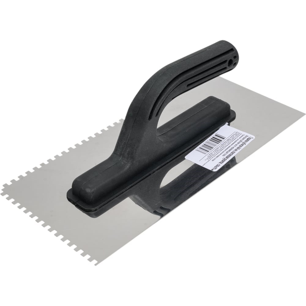 Зубчатая гладилка используется для выравнивания штукатурного слоя и равномерного нанесения клеевого состава. Рабочее полотно изготовлено из нержавеющей стали, что обеспечивает прочность и коррозионную стойкость. Материалы не прилипают к полированной поверхности гладилки, поэтому она подходит для нанесения даже быстрозастывающих смесей. Удобная рукоятка обеспечивает надежный хват.