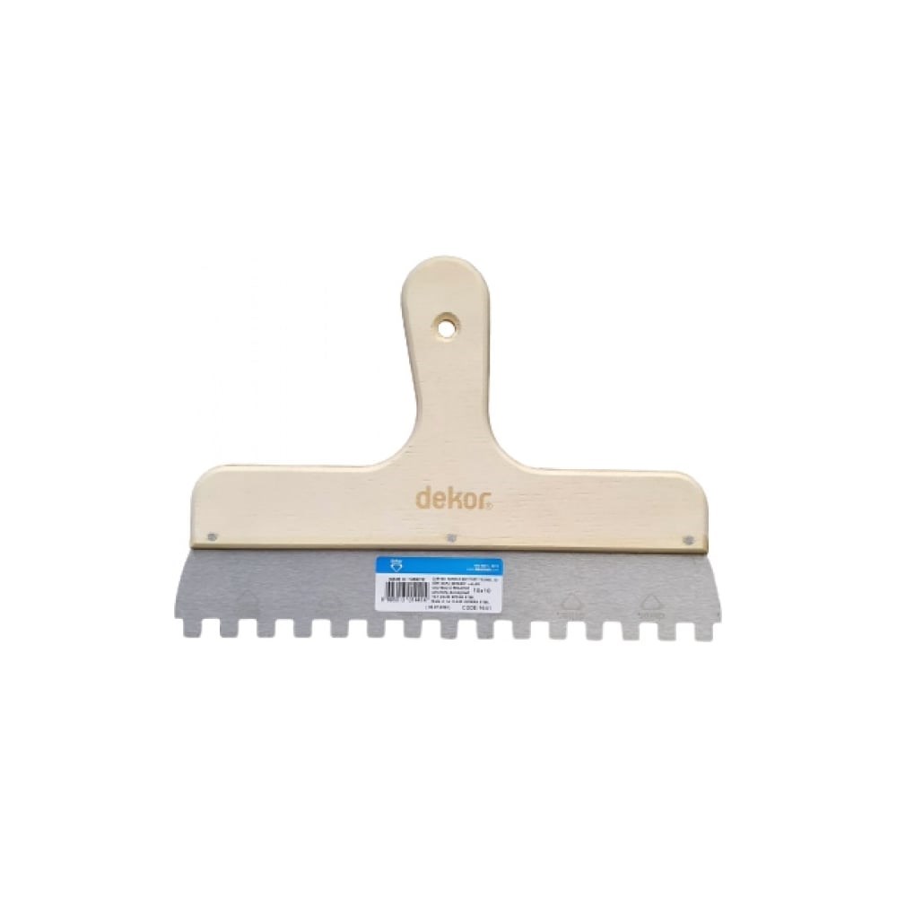 Зубчатый шпатель DEKOR HASSAN 40см с деревянной изогнутой ручкой, зуб 8х8мм 1442, подойдет для нанесения на поверхность клеевых составов и смесей. Деревянная рукоять надежно удерживает полотно благодаря дополнительному крепежу. Он исключает вылет полотна из рукояти, что повышает удобство и надежность. Полотно сделано из обычной стали.