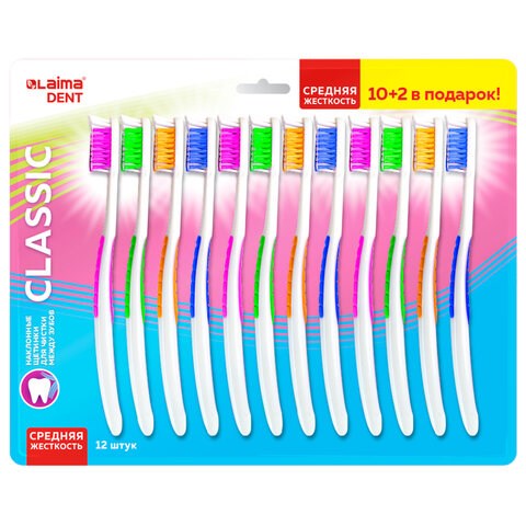 Зубная щетка средней жесткости, КОМПЛЕКТ 12 шт. (10 + 2 в подарок), LAIMA DENT "CLASSIC", 609693